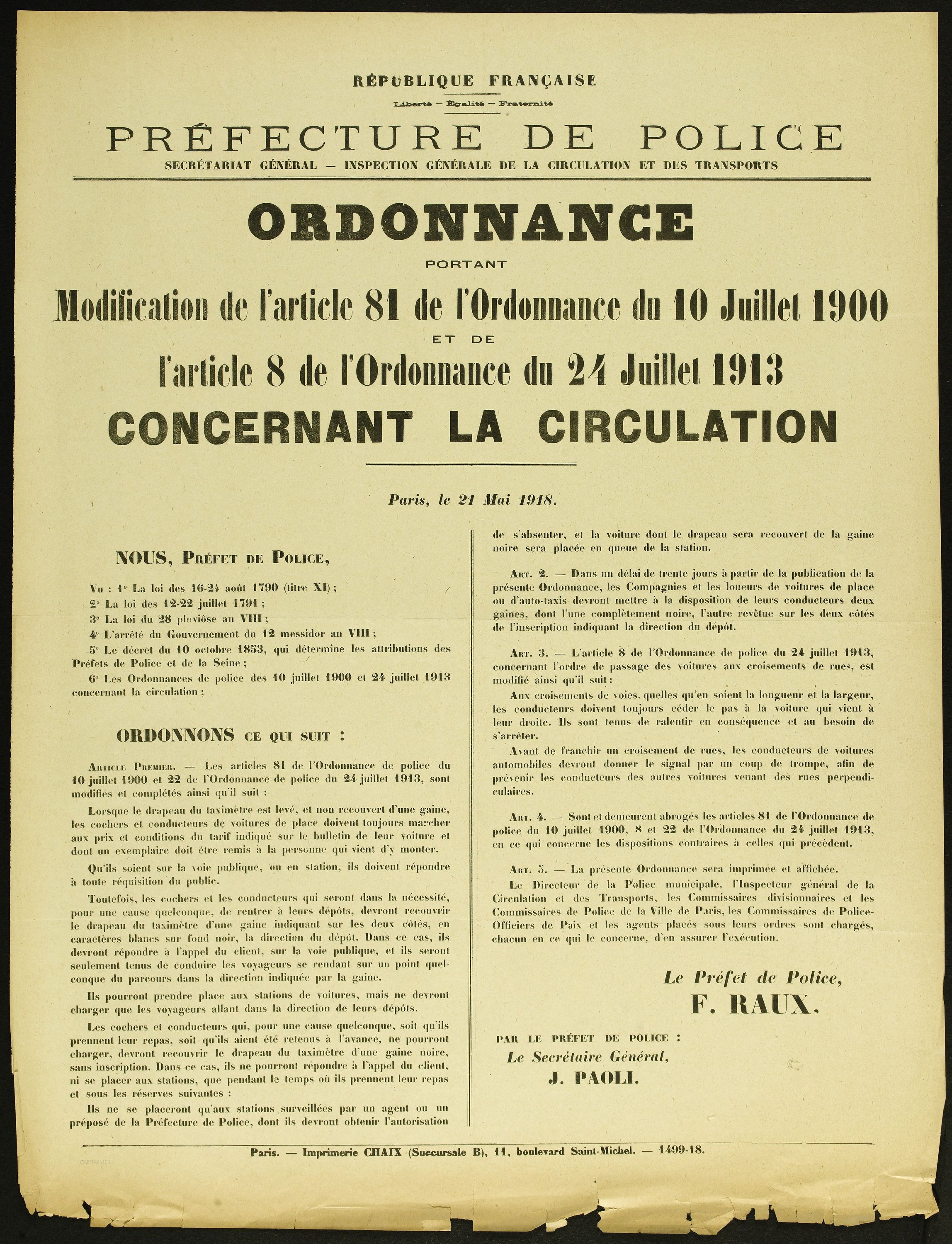 Celui de l’ordonnance de la préfecture de police de Paris en date du 21 mai 1918 concernant la circulation. L’article premier modifie et complète les articles 81 de l’Ordonnance de police du 10 juillet 1900 et 22 de l’Ordonnance de police du 24 juillet 1913.